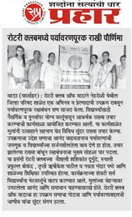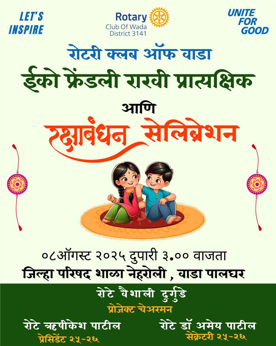 The Rotary Club of Wada organized an Eco-Friendly Rakhi celebration at ZP School, Nehroli, promoting environmental awareness among students. A hands-on training session was conducted to teach children how to make eco-friendly rakhis using sustainable and biodegradable materials. The activity encouraged creativity while spreading the message of protecting nature and celebrating festivals responsibly.