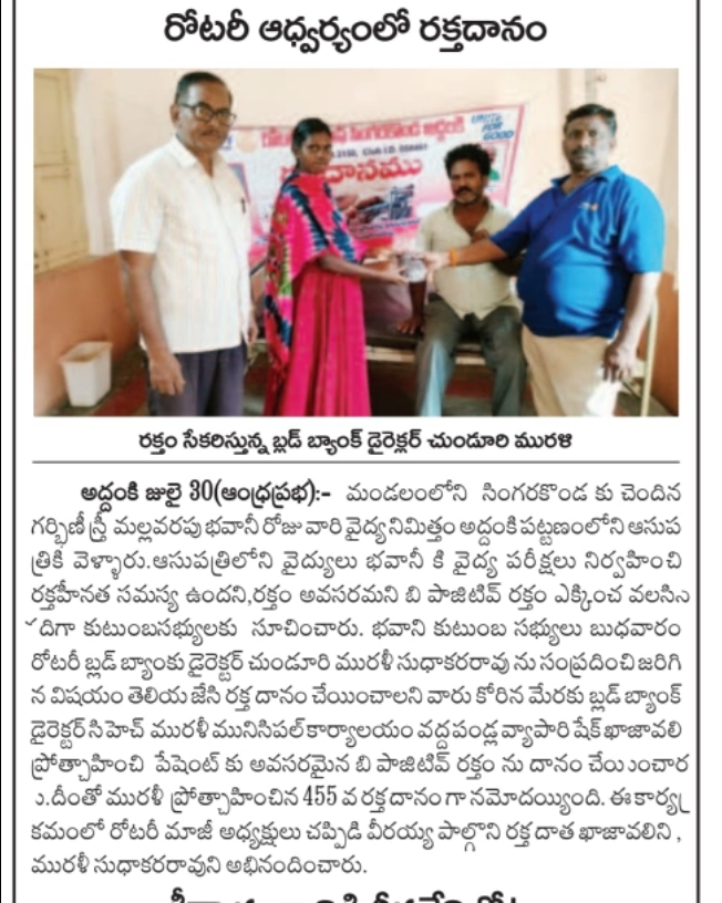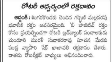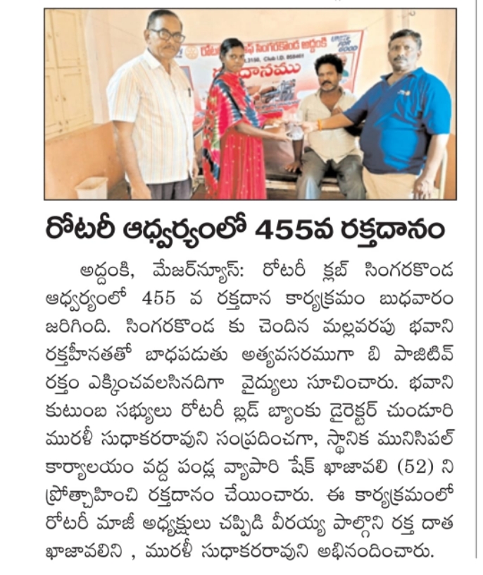 R.C.Singarakonda arranged Blood donation to animic pregnant women M.bhavani (20) Blood doner was shaik Khajavali(52) this is 455 th blood Donation by R.C Singarakonda. Past President Ch. Veeraiah, Ch. Murali Sudhakararao attended.