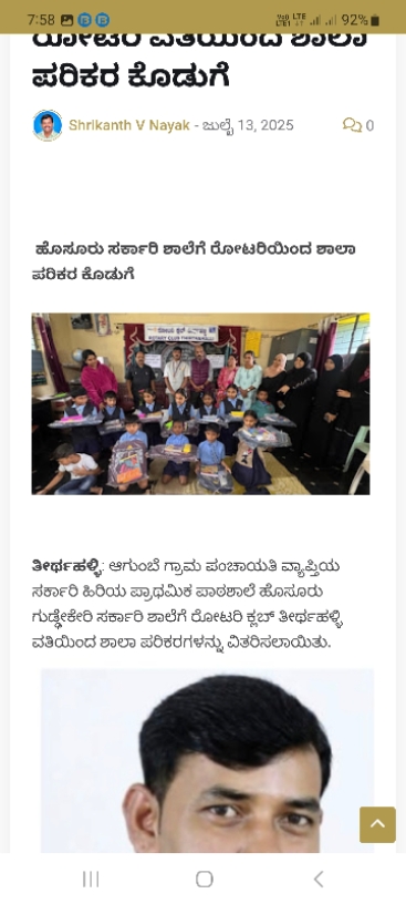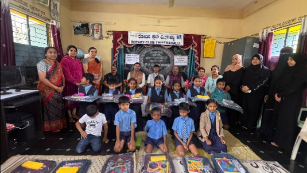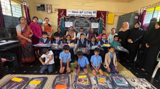 Date; On 11-07-2025, the Rotary Club donated school bags, notebooks and pens to the children of Government Higher Primary School, Guddekere-Hosur School, Agumbe Hobli.