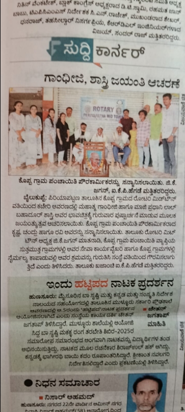 On the Occasion of Gandhi Jayanti and Lal Bahadur Shastri Jayanti, we honoured three Koppa Panchayat workers for their dedication in keeping the town clean and healthy.