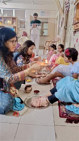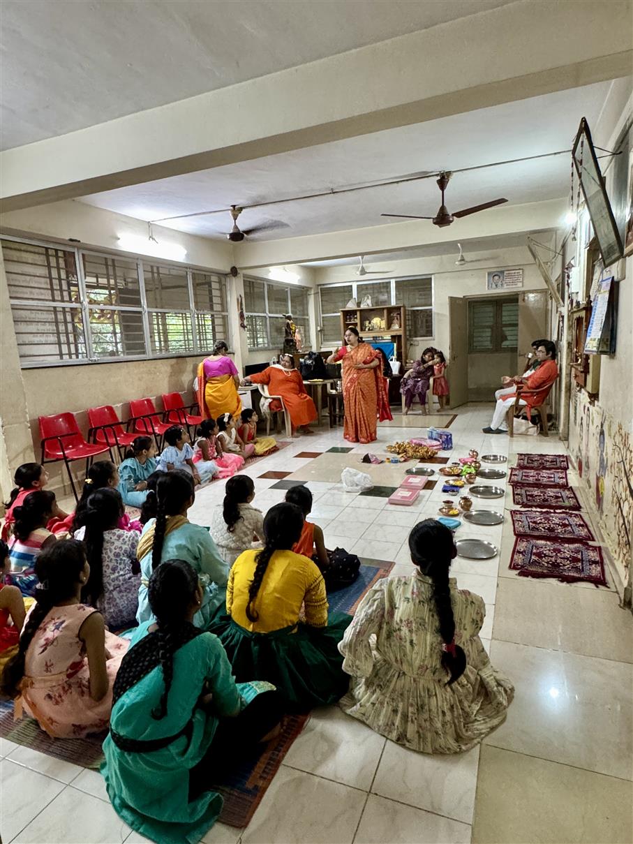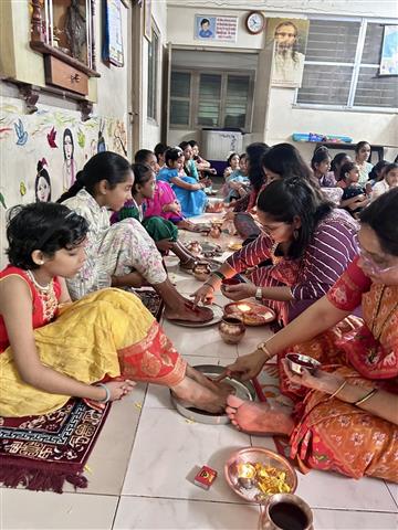 Today, despite the forecast of heavy rain, we all stayed determined. President Deepali, Secretary Meena Jeswani, a prospective member Rtn. Amol. Rtn. Mansi and family friends travelled through the pothole-filled, waterlogged roads of Bhiwandiand in spite of the difficult conditions reached on time. There, we performed Kanya Pujan (worship of young girls) for about twenty-nine girls.