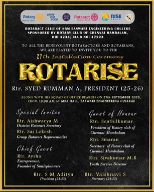 RC Chennai Mambalam oversaw the installation function of Rotaract Club of SRM Easwari Engineering College as the new team announced multiple projects planned for the year with appreciation for the team that has just concluded its tenure. Our Youth Service Director Rtn Shivakumar shared his commendable pearls of wisdom to the young Rotaractors in taking up roles and responsibilities in community service.