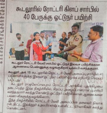 Driving Skill Training started today for 40 aspirants form economically underprivileged section , issued LLR by Chief Guest Gudalur DSP Thiru.V.Vasanthakumar to the aspirants , the skill development initiative with collaboration with Hyundai, Navjyoti trust and Star Driving School. The project was coordinated by Rtn.Rejeesh having Driving School taking initiative to Train the aspirants up to get Driving license from the authority.