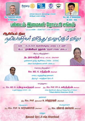 On the Occasion of Teachers Day Celebration, President Rtn PHF N Sundarrajan, Honoured and Best Teacher Award to Mrs. N. Thamayanthi, In the presence of Guest of Honour Rtn. K Chandran, District Literacy Chair, Secretary Rtn G Narayanasamy, Treasurer Rtn. Manoj Agarwal and our Rotary Members.